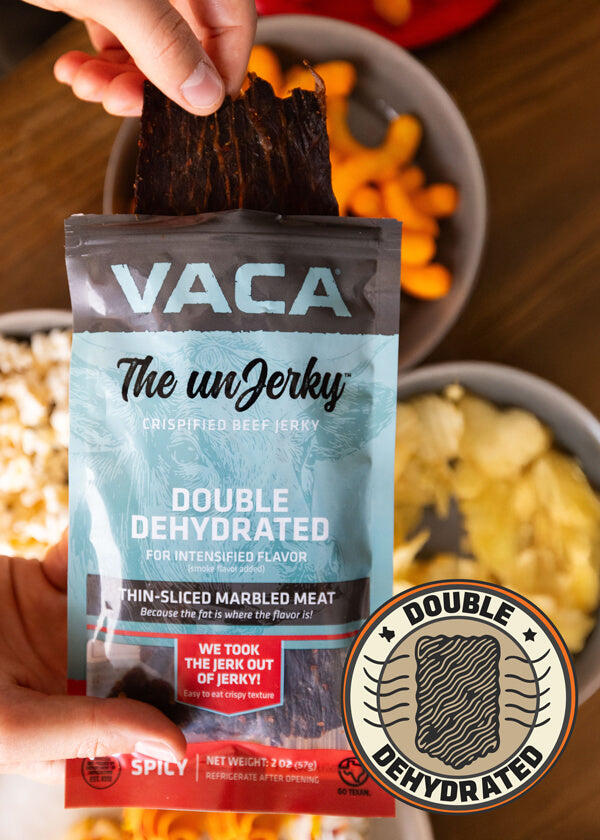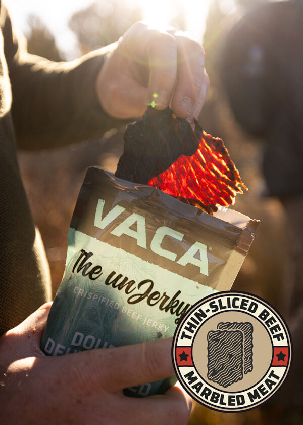 The ingredients you'll find in VACA Jerky are very simple. There is nothing that you can't pronounce. What makes VACA unique is that we start with marbled meat, which we slice thin and then double dehydrate. This results in a light and crunchy "crispified" jerky with intensified flavor.